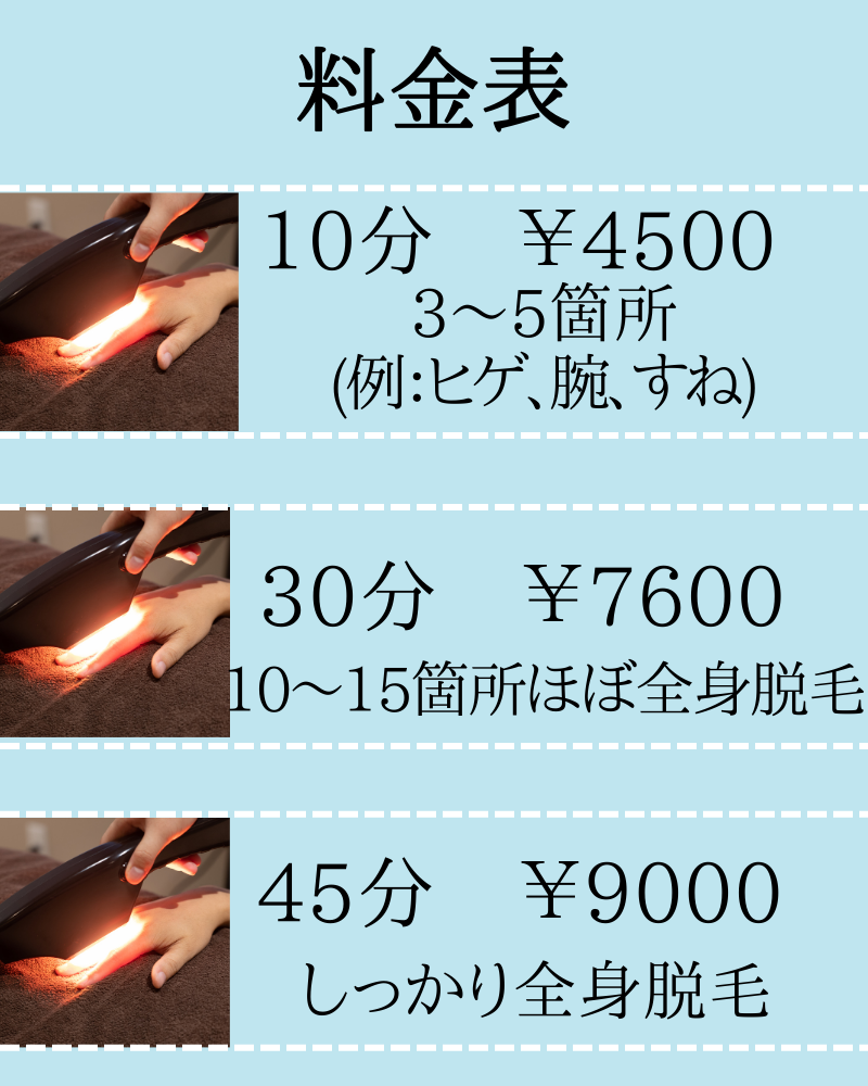 | 45分(しっかり全身脱毛) | ¥9000→¥6300 |